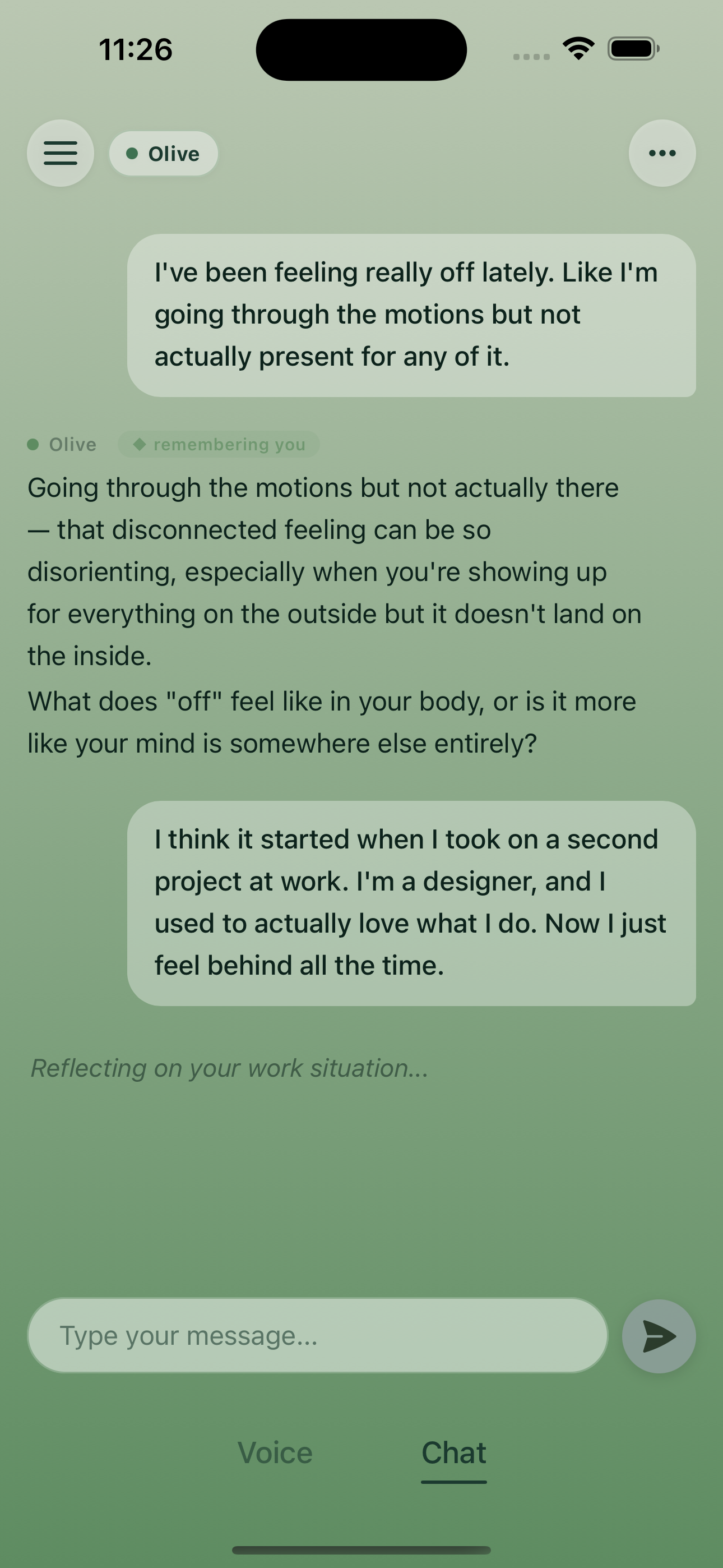 Olive is a private chat companion that listens, remembers what matters to you, and helps you take the next step toward real-world care — in your own time, without pressure.